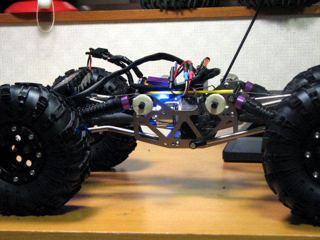 まずはタイヤをHPI ROCK GRABBERに変更しました。 2.2サイズでは最大級の140mmの外径が登山には有利なはずです。 3RACINGよりも柔らかいコンパウンドですので、まだ喰うはずです。 本当はHBのROVERが欲しかったんですが、どこも売り切れでした。 それに続けとGRABBERまでもが無くなってきたところへ、RSS様の特価販売。 早速飛びつきました。w RSS様ありがとうございます。m(_ _)m そしてサーボプレート作りました。^^ リア用の精度の悪い変形プレートです。w なんでこんな形にしたかというと・・。 こんな感じにウインチサーボを載せるためです。 サーボマウントの取り付け位置が逆ですが気にしない。^^ ウインチサーボを載せるに当たり、ディグを外しました。 正直、登山にディグは全く必要ありませんから。 てか、本当は登山用の2.2マシンを別で一台作りたかったんですが間に合いそうもないので、今回もTLTです。 小さいビラカンに0.45mmのステンレスワイヤーを通しています。 ちょうどクロスメンバーの真ん中にワイヤーの通れる穴が空いていたので、有効活用しました。 ワイヤーはこのままフロントのクロスメンバーを通って、フロントサーボプレートに繋がっています。 はい、今回の小細工、ウインチはウインチでもウインチダウンサスペンション機構なんです。 ウインチ操作で車高調整できるというものです。 なのでドループ廃止しました。 通常走行や障害物などでは車高を上げて。 ここぞというときには、ウインチ操作で車高を下げてへばり付いてみせます!!^^ しかし何度サーボのポテメを調整しても、次第に勝手にサーボが回り出す始末・・・。 放って置いたらジワリジワリとお犬様の伏せ状態。爆 CC用に作ったMG995のサーボはそんなこと無かったのにな・・・最悪移植しようっと。 |