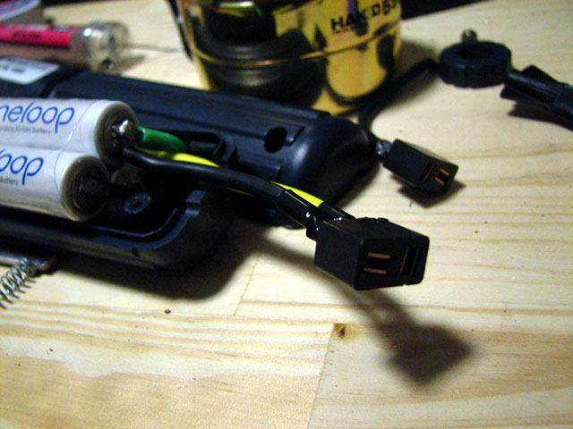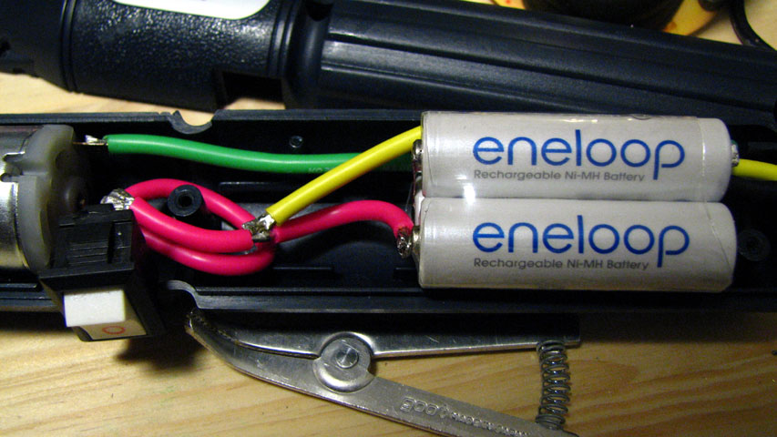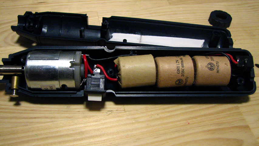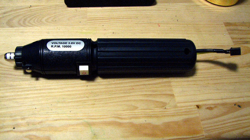 その昔オークションにて購入した、充電式のコードレスリューターです。 でもほとんど使っていません、、。 その理由は・・・使いたいときに充電切れ、充電時間は8時間で、いざ使ってもパワーバンドが取りだせるのが最初の数分・・。 さすが安物! そんな話をやまさんと会話(ネット上で)していたので、リューターを見て物思いにふけっていました。w そうだ、改造しよう! 早速分解してみました。 充電電池は得体の知れないニッカドの600mAh×3セル。 たぶんこいつを変えれば少々パワーアップできるはず。 A123でもいいかもしれないけど、対応充電器もないし却下。 やっぱり自己放電考えたら、エネループでしょ。 3.6V仕様なので、単三エネループ×3セルで決定しました。 早速、手持ちの余っているエネループを半田付けしました。 ちょうど本体に収まる大きさです。 ついでにコード類も図太くしてみました。^^ 充電コネクタもストロングコネクタに変更。 これで手持ちの充電器で充放電出来ます。 コネクタはリューター本体に埋め込ませたかったんですけど、その作業にはリューターがいるので・・。爆 ヤスリでちまちま削り作業も面倒くさいので、飛び出しています。 完成。 エネループの容量が2000mAhなので、電池容量は単純計算で3倍以上になりました。 早速充電して回してみたら、ニッカドの時より遙かにパワーはあります。 コードレスだけにさすがに限界トルクはありますが、長時間使えるようになったので少々ご満悦。^^ |